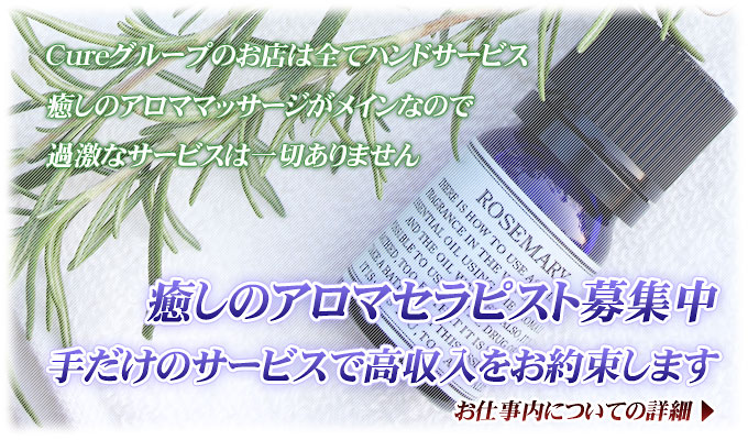 アロマエステに興味がある、稼ぎたいけどハードな風俗には抵抗がある、手だけのサービスがいい、エステティシャンの経験を活かして高収入が欲しい等、皆さんの希望に答える事が出来るアロマエステ専門店がCureグループです♪